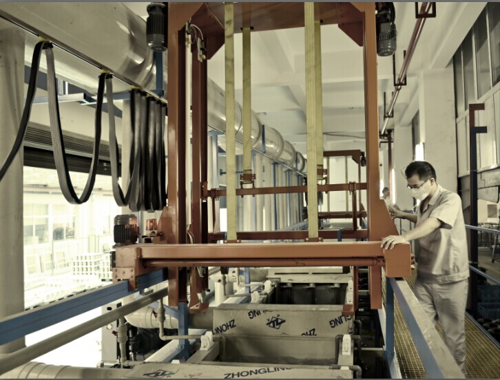第一條生產(chǎn)線是2012年建成的,主要是對(duì)金工和腰輪的殼體、葉輪、機(jī)芯、轉(zhuǎn)子、端板、端蓋等關(guān)鍵零件進(jìn)行陽(yáng)極氧化處理。對(duì)不同材料的殼體及零部件進(jìn)行陽(yáng)極氧化處理時(shí),其電解液溫度、電壓和工序是不同的,工藝要求也不一樣,需要進(jìn)行分批處理。如:金工車間殼體進(jìn)行硬質(zhì)陽(yáng)極氧化時(shí),溶液內(nèi)溫度要調(diào)至6~9度;而腰輪車間G10~G400-4〞 殼體進(jìn)行硬質(zhì)陽(yáng)極氧化時(shí),溶液內(nèi)溫度是0度;另外,在進(jìn)行硬質(zhì)陽(yáng)極氧化之前還要放入酸洗槽,進(jìn)行化學(xué)拋光處理。這樣,不僅操作工序繁雜,而且時(shí)間上也比較漫長(zhǎng),效率不是很高。因此,現(xiàn)增設(shè)了第二條陽(yáng)極氧化生產(chǎn)線,運(yùn)行后,可以兩邊同時(shí)進(jìn)行陽(yáng)極氧化處理,工作效率得到了明顯的提高。