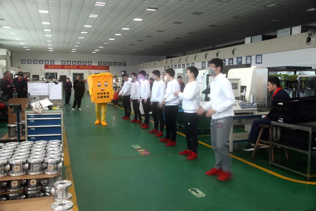 2018年1月11日,一場(chǎng)別開生面的環(huán)??扉W秀活動(dòng)在天信廠區(qū)上演。正當(dāng)員工們?cè)谧约旱膷徫簧嫌袟l不紊工作時(shí),金工車間空地上突然響起了時(shí)尚動(dòng)感的曳步舞音樂,只見八位帶著灰色口罩、穿著統(tǒng)一衣服的天信文藝俱樂部成員從工作崗位上來到空地中間,配合著音樂激情熱舞,炫動(dòng)全場(chǎng)。中間還有一位萌萌的、扮演垃圾桶的黨員志愿者,向圍觀的員工作垃圾分類的宣傳。